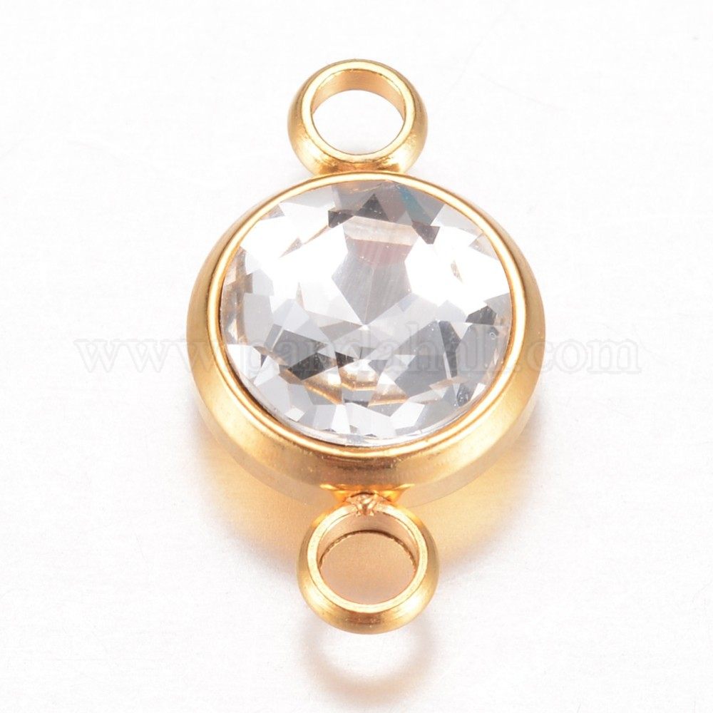 Glass Links/Connectors, Faceted, with 304 Stainless Steel Findings, Flat Round, Golden, CrystalSize: about 10mm wide, 17.5mm long, 6.5mm thick, hole: 2.5mm.