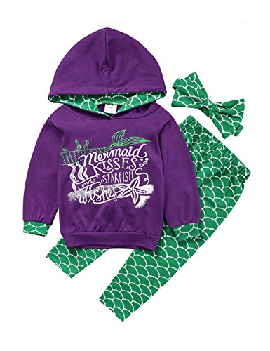 Gogoboi 3pcs Mermaid Outfit Set Long Sleeve Hoodie Top+Pants+Headband Suit For Baby Girl 1-6T (Purple, 2-3T)