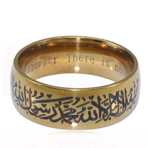 GOLD PLATED Muslim Jewellery Ring with Shahada in Arabic & English AVAILABLE SIZE: , 9,10, 11. This ring has the Shahada in Arabic script with Black writting around the outside of the ring, and the English translation of the Shahada on the inside. The ring is made of the gold plated. A lovely gift for Men and Women.Gold Plated Muslim Jewellery Ring with Shahada in Arabic & English ( Size 9, 10, 11)