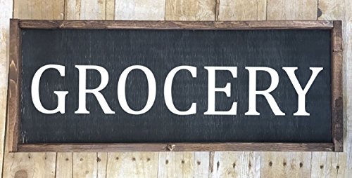 This black and white grocery sign is hand painted and sealed with polycrylic and framed with hand cut stained wood. It measures 25 x 9 inches. The frame allows you to hang it on a nail or screw. This will look great in your home. If you need different colors or a different sign please contact me.