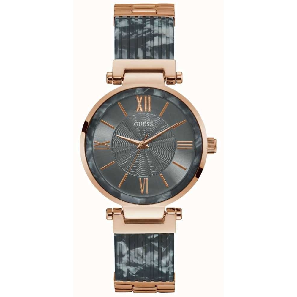 Item Shape – Round Dial Window Material Type – Mineral Display Type – Analogue Clasp Type – Fold-over Clasp with Safety Case Material – Rose Gold Tone Stainless Steel Case Diameter – 36.5 millimetres Case Thickness – 8.7 millimetres Band Material – Stainless Steel Band Length – Women’s Standard Band Colour – Rose Gold Tone Dial Colour – Grey Marbled Bezel Material – Stainless Steel Movement – Quartz Water Pressure Resistance – 3 bar A collection of Iconic signature combinations inspired by the Guess Soho lifestyle range. Trendy fashion-forward design, features a polished rose gold tone case, a slate grey marbled resin dial and a bracelet with adjustable rose gold tone links