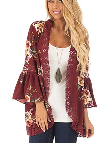 Halife Women’s Summer Lace Pleated Floral Printed Kimono Cardigan Coat Wine Red,XXL