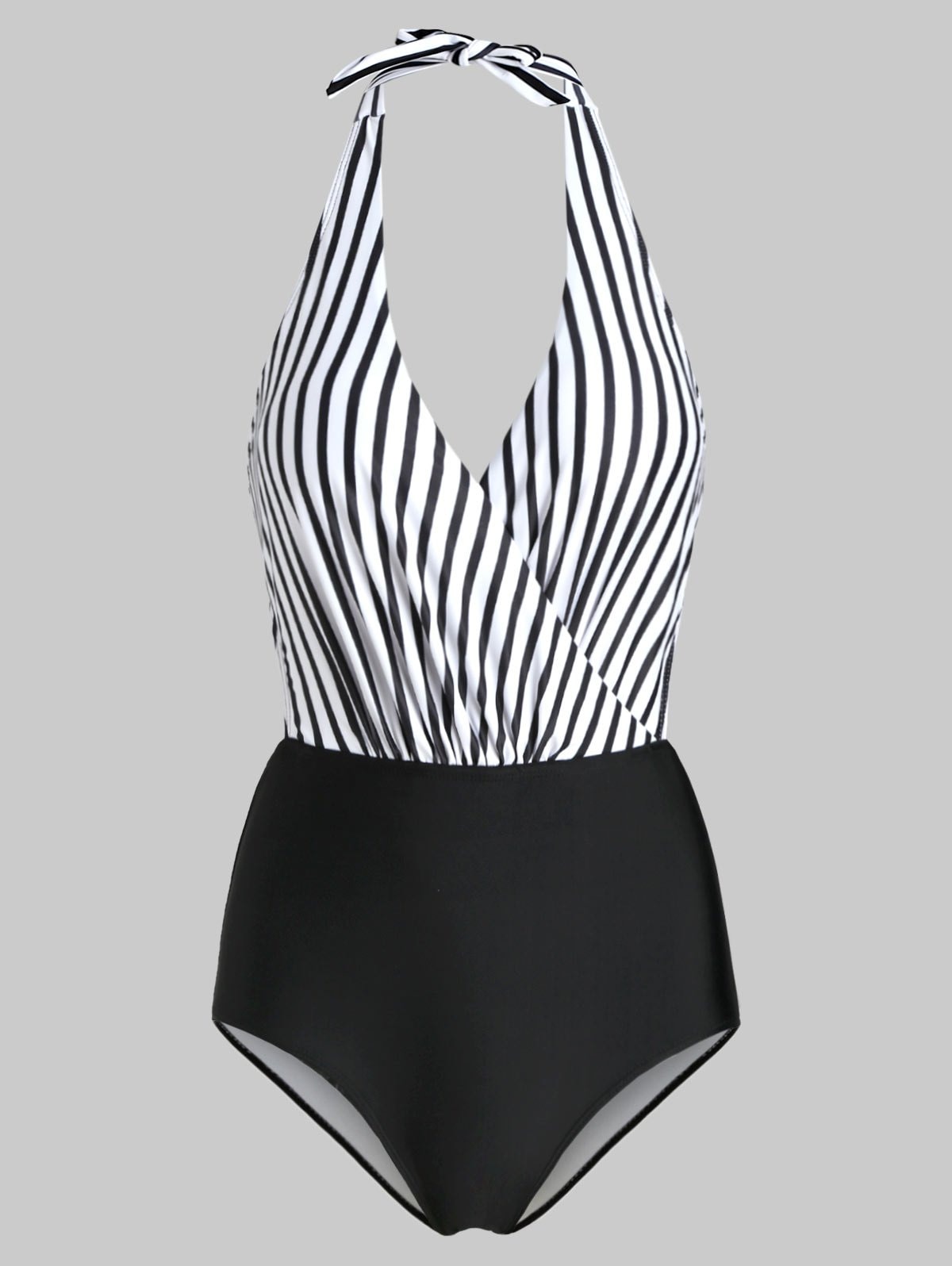 Halter Striped Polka Dot Surplice One-piece Swimsuit