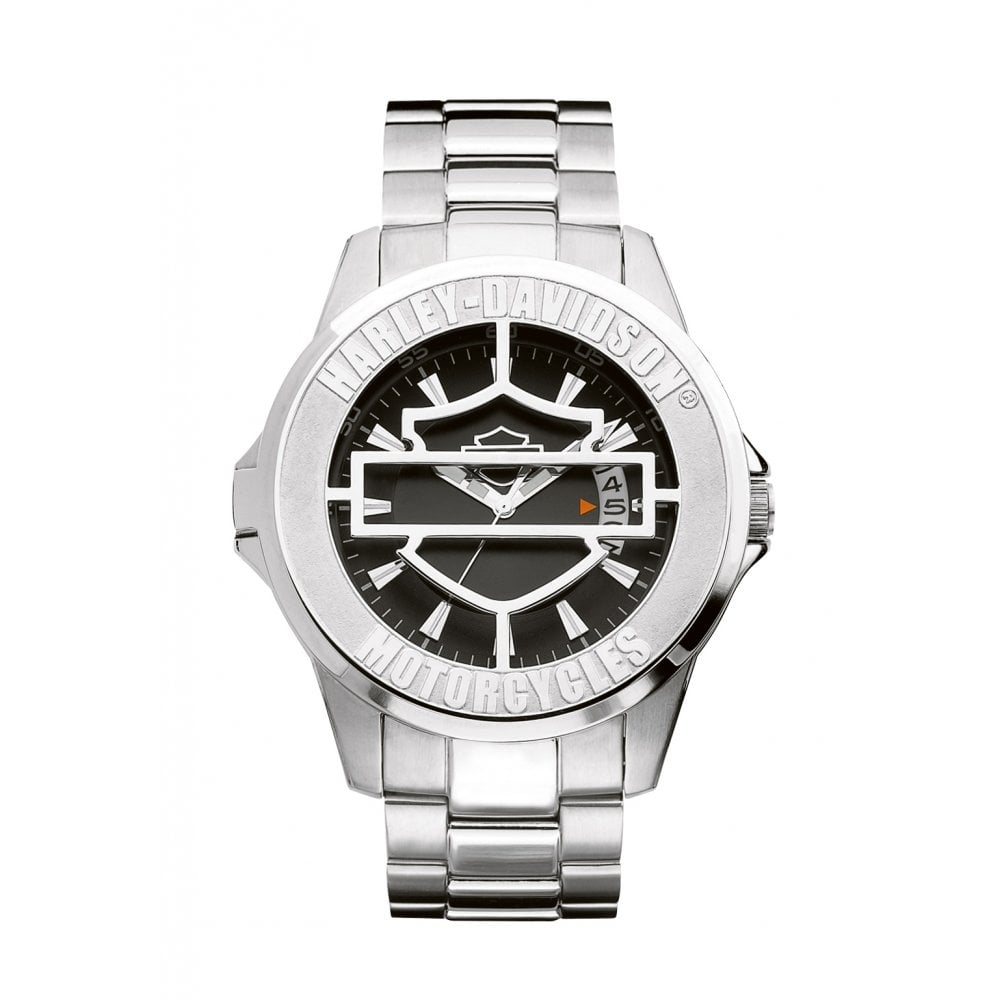 Item Shape Round Dial window material type Mineral Display Type Analog Clasp Fold over Clasp Case material Stainless steel with hinged cover Case diameter 35 mm Case Thickness 11 Band Material Stainless Steel Band length Men’s Long Band width 20 mm Band Colour Silver Tone Dial colour Black Movement Analogue-quartz Water resistant depth 50M Factory Warranty Built to endure, whatever the challenge, Harley-Davidson Timepieces by Bulova reflect the uncompromising pursuit of excellence of two of America’s most honored companies. Founded in Milwaukee in 1903, Harley-Davidson continues to produce the world’s most acclaimed motorcycles. Bulova, established in New York City in 1875, enjoys international renown for timepieces of superior quality and precision. Drawing on more than 200 years of exceptional craftsmanship, these proud American companies have joined forces to create a collection of watches with the strength, style and durability worthy of both great names. Harley-Davidson Timepieces by Bulova. Officially Licensed Harley-Davidson Product by Bulova Corporation