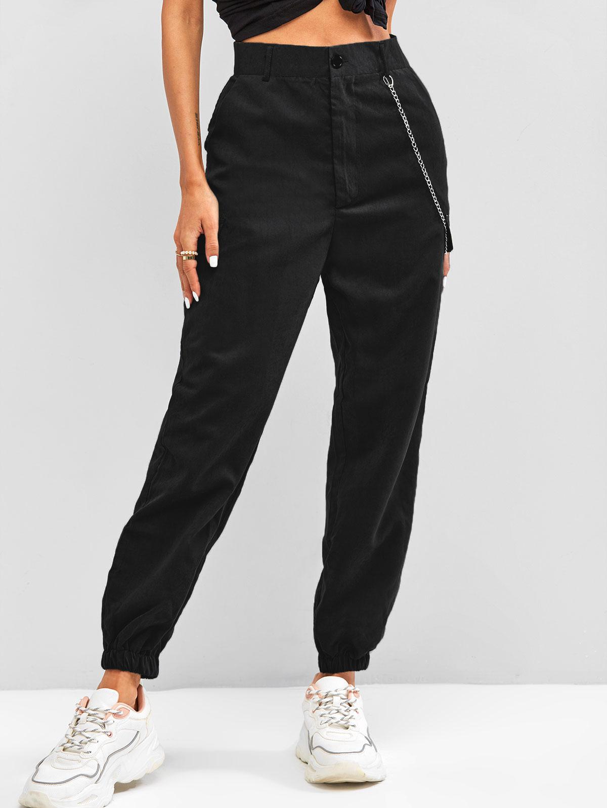 Zaful A sleek update to a classic joggers style, these high-rise pants are updated with two flap details and a chain design for an easy yet polished alternative to your off-duty jeans. Style: Fashion Material: Polyester,Spandex Waist Type: High Fit Type: Regular Front Style: Flat Decoration: Chains