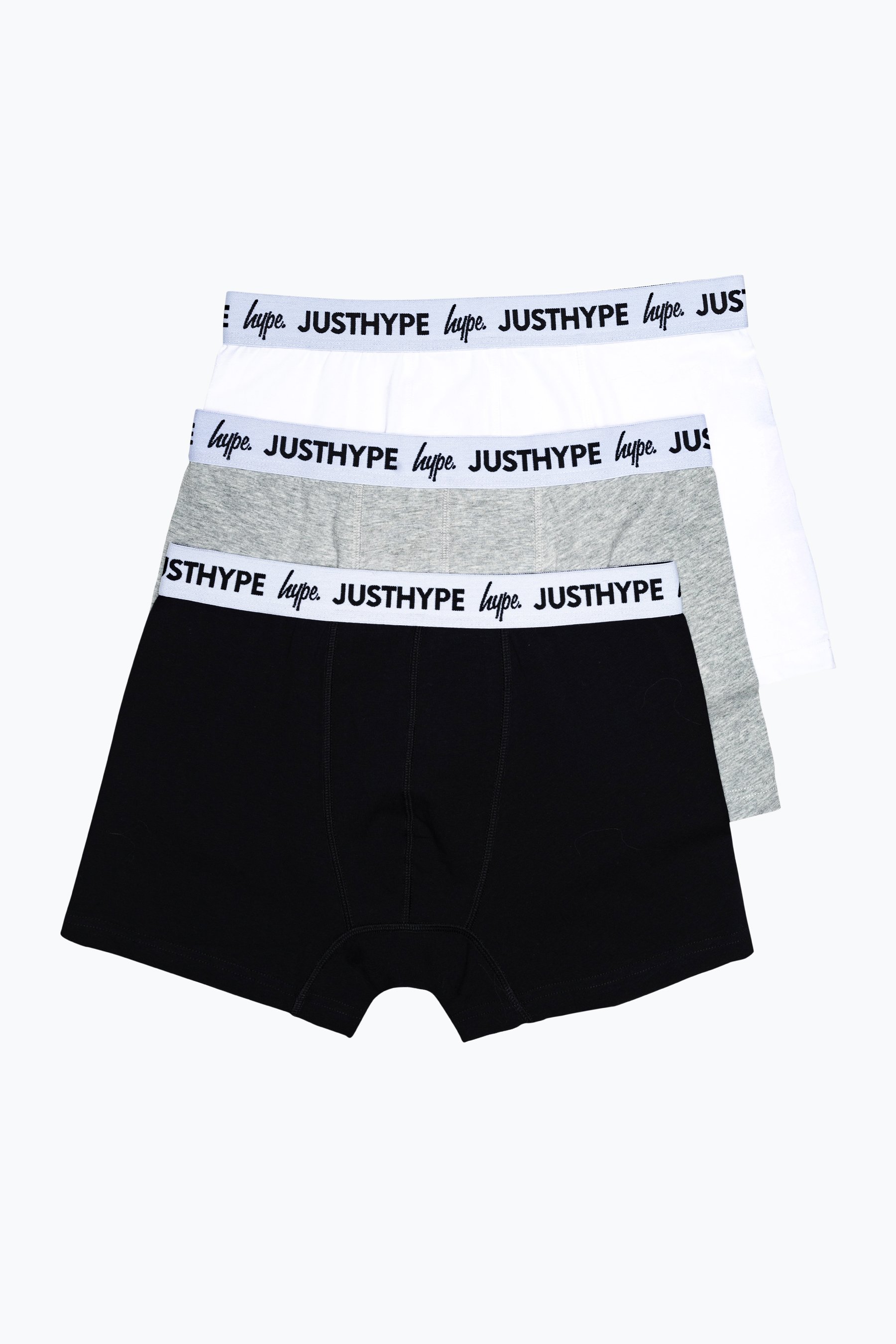 Take your pick on our boxers, styles that require no effort. Colour Multi Pattern Script Gender Boys Closure Type No Closure Care Instructions Machine wash at 30øC Model Name SCRIPT Fit Type Fitted Item Length Short Waist Style Regular | Hype 3 Pack Monotone Kids Boxer Multi Shorts | Size 9/10Y