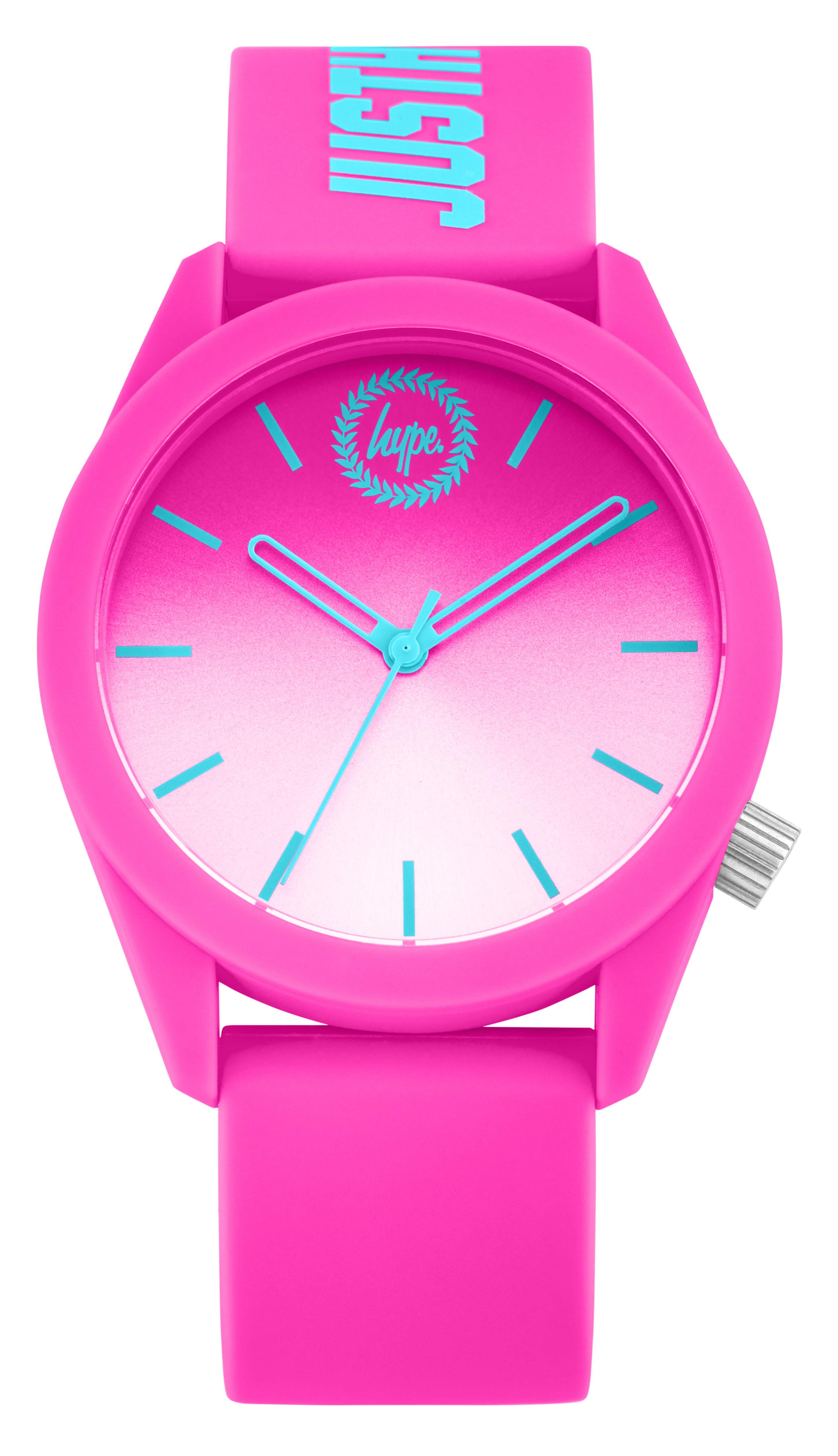 Designed with the importance of making a statement with your accessory choice. Colour Pink/Blue Pattern Script Gender Unisex Closure Type Tang Buckle Care Instructions Wipe Clean Only Dimensions Case W-3mm H-3mm Band Width 21mm Model Name SCRIPT Inner Material Type Bezel – Plastic. Glass – Window. Print Type Dial – White with Black Logo | Hype Fuchsia Kids Watch
