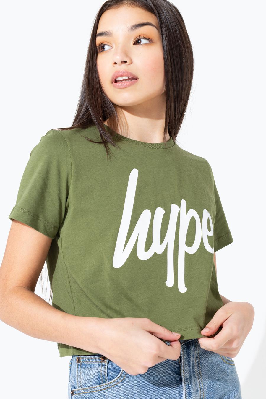 Hype Khaki White Script Kids Crop T-Shirt | Size 13