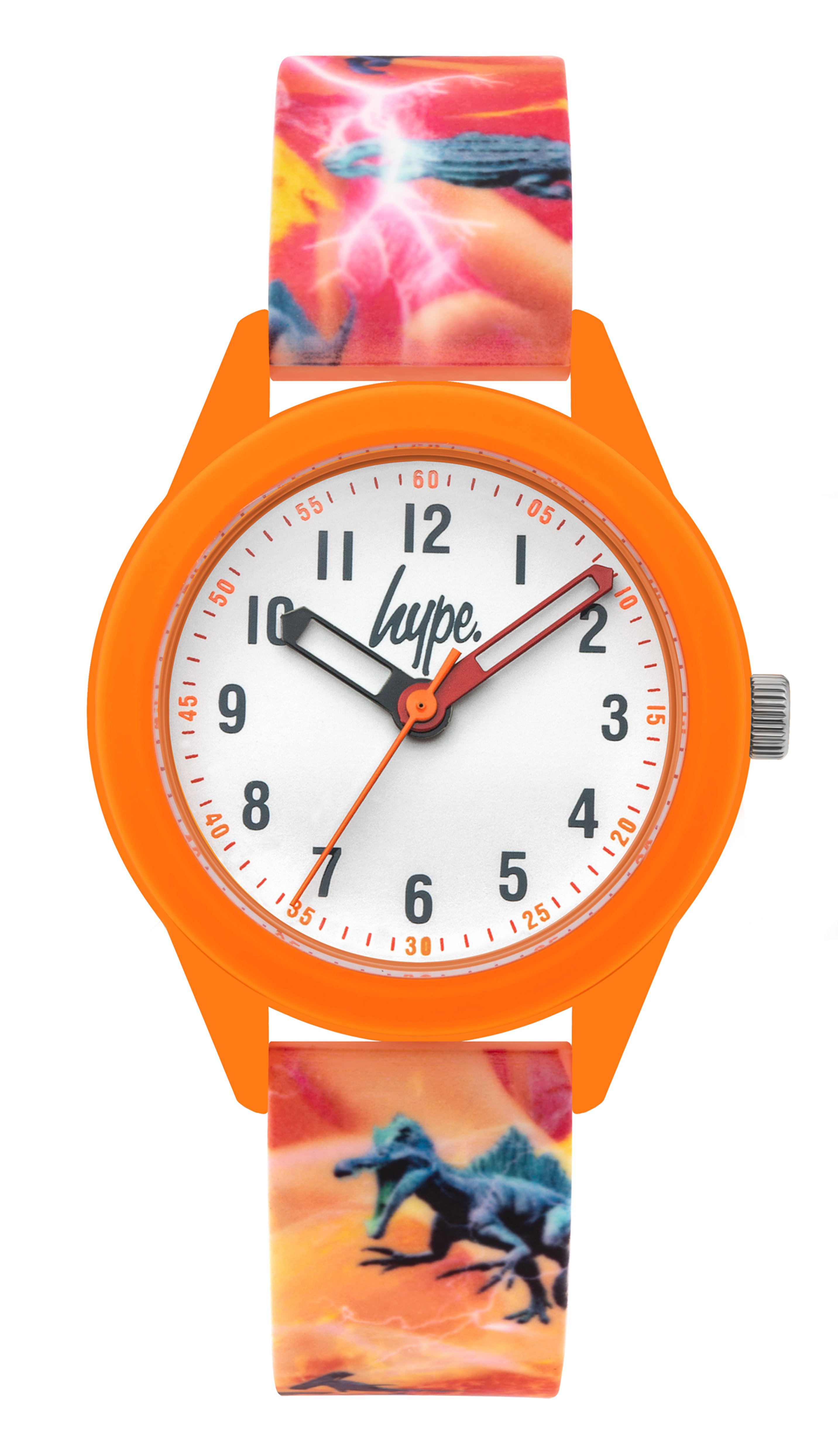 Designed with the importance of making a statement with your accessory choice. Colour Multi Pattern Animal Gender Unisex Closure Type Tang Buckle Care Instructions Wipe Clean Only Dimensions Case W-3mm H-3mm Band Width 21mm Model Name ORANGE DINOSAUR Inner Material Type Bezel – Plastic. Glass – Window. Print Type Dial – White with Black Logo | Hype Orange Dinosaur Kids Watch
