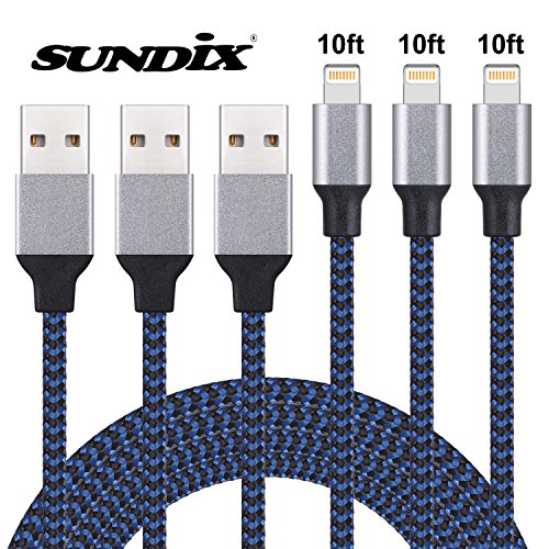 iPhone Charger Sundix Lightning Cable 3Pack 10FT Extra Long Nylon Braided Charging Cord Compatible With iPhone X 8 Plus 8 7 Plus 7 6 6S 6 Plus 5S SE iPod iPad Mini Air Pro–Blue