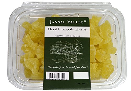Jansal Valley Dried Pineapple Chunks, 1 pound. This tasty fruit makes for a great snack when dried. It makes a great addition to trail mix, can be added to cereal or salads, or dipped in chocolate for a decadent treat.1 pound dried pineapple chunks