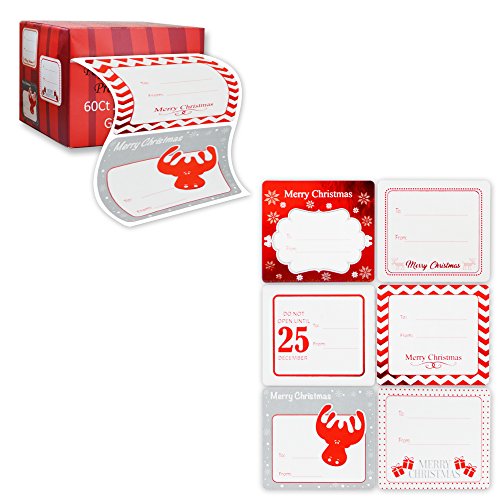 Jumbo Christmas Gift Tag Stickers 60 Count Modern Red, White, Silver, and Gold Xmas Designs – Looks Great on Gifts Presents, Wrapping Paper and Gift Bags.