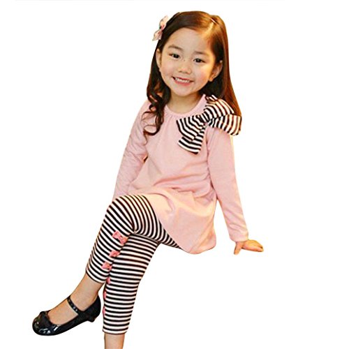 Kemilove 2-7 Years 2Pcs Kids Little Girls Clothing Long Sleeve Bowknot Dress T-Shirt + Stripe Pants Set (6T, Pink)