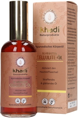 The secret to wonderfully smooth skin Khadi’s 10 Herbs Cellulite Oil was specially formulated to stimulate the metabolism of the various skin layers, thus expelling fats and toxins. The combination of herbs serve to provide various functions to create warmth for proper blood circulation in the affected areas. These herbs in conjunction with regular massages activate the lymphatic system to remove fats and toxins. Mustard oil helps to detox while sesame oil is responsible for transporting the effects of the various herbs to the cells. Nagarmotha, also known as cypriol, activates the metabolism of the cells and dissolves fat. Vacha stimulates the nerves and trikatu causes sweat to expel toxins and fat. Manjistha helps regulate the lymphatic system. Several herbs such as tumeric and ajwain serve as powerful cleansers. Cinnamon serves to direct the herbs and oils to the layers of the skin, while clove oil increases blood circulation. Application: For optimal effects, massage on the skin mornings and evenings, and let the oil absorb into the skin. Remove any excess oil with a cloth. You will feel a warming sensation on the treated areas of the skin. This signals that the desired effect is taking place, i.e. blood circulation and lymphatic circulation is stimulated. Only suitable for external use. Not suitable to use on the face. Do not apply to broken skin. Ingredients (INCI): Sesamum Indicum (Sesamöl)**, Brassica Juncea (Braunes Senföl)*, Rosmarinus Officinalis Oil (Rosmarin)*, Zingiber Officinalis (Ingwer)*, Cyperus Rotundus (indisches Nussgras)*, Acorus Calamus (Kalmus)*, Citrus Medica Limonum Peel Oil (Limone)*, Citrus Aurantium Dulcis Peel Oil (Orange)*, Piper Nigrum (Pfeffer)*,Piper Longum (Pippali)*, Curcurna Longa (kurkuma)*, Cinnamomum Cassia Extract (Zimt)*, Pogosternon Cablin (indisches Patchuli)*, Rubia Cordifolia (Manjistha)*, Carum Copticum (Königskümmel)*, Eugenio Caryophylllus (Nelke)*, Crocus Sativus (Safran)*, Linalool***, Limonene***, Citral***, Geraniol***, Cinarnyl*, Alcohol***, Eugenol***, Cinnamal***, Coumarin***, Benzyl Benzoate***, *Bestandteil nat. ätherischer Öle **aus kontrolliert biologischem Anbau *Bestandteil nat. ätherischer Öle & aus kontrolliert biologischem Anbau