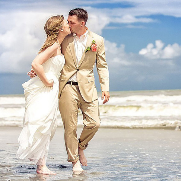 Khaki Beach Wedding Suits for Men Groom Tuxedos 2 Pieces (Jacket+Pants) Slim Fit Bridegroom Best Man Blazern Prom Wear