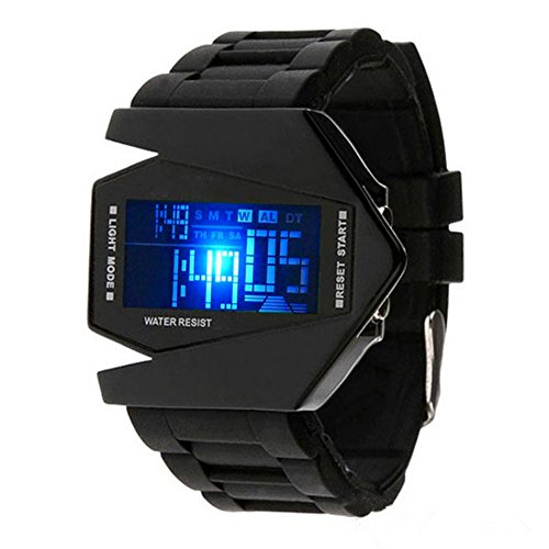 We are a watch factory with 1000+ workers and 10000+ square meter area, doing OEM for many good brands all over the world for more than 10 year.As new seller on amazon, we sincerely provide best products and best price to you, pls send email to us if you have any problem on this watch,will reply within one dayHighlights: • Original Japanese Electronic Movement & Japan SEIKO button battery: provide precise and accurate time • High Quality ABS case and STAINLESS STEEL back case. • High Quality Silicone Strap • Highly Transparent Resin Glass• Stainless Steel Buckle • 50M Water Resistant: Daily Use Waterproof, Hand Wash, Shower, Swimming, NO Problem. • MULTI-FUNCTIONAL: Design Calendar Date Window, Dual Time Display, Alarm, 50M Waterproof, 7 Colors EL Back Light Display, Shock Resistant, Stopwatch Material: • Case Material: ABS • Back Case Material: Stainless steel • Band Material: Silicone • Mirror Surface: Highly Transparent Resin Glass • BUCKLE:Stainless Steel Specification: • Dial Case Diameter: 1.89×1.65 inch / 4.8×4.2 cm • Dial Case Thickness: 0.39 inch / 1 cm • Band Width: 0.79 inch / 2 cm • Band Length: 9.84 inch / 25 cm • Band Clasp Type: Buckle • Watch Weight: 1.76 oz / 50 g **NOTE**: • Please DO NOT PULL OUT the Button Underwater. Use in extreme Hot or Cold temperature will shorter watch life. • If mist or droplets found inside watch surface, please contact manufacturer immediately. • Clean the strap by a soft cloth on regular bases is highly recommended. • Too much water contact will shorter watch life. What Is In The Package: •Angels’ Sport Digital Watch x 1• Watch packing box x 1•Usage manual x 1How to turn off ALARM?Press four keys at the same time for several seconds, the “AL” lights off means ALARM has been turn off.【TWO NEW DESIGNS】:1.New warcraft fighter design.Suitable for age from 10 to 28.The novel 2017 autumn new warcraft fighter design realizes your children’s dream of fighter-pilots,meet their imagination of blue sky.2.Seven colors backlight with flash function.7 colors backlight for your choice,also,these 7 Colorful backlights can be flashed.