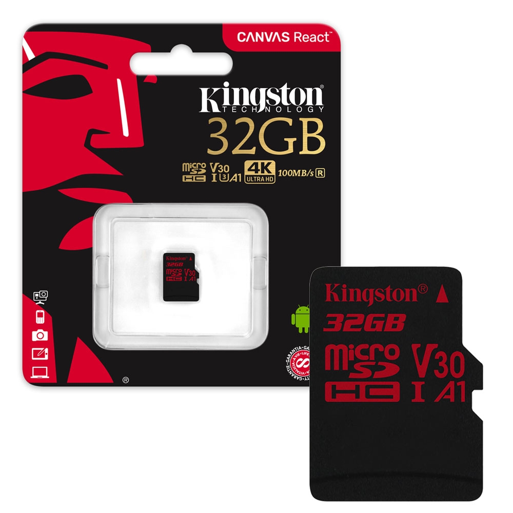 Incredible speeds for amazing visualsKingston’s Canvas React™ microSD card is designed to be as fast as you are, capturing 4K video or taking stunning burst-mode photos when the action doesn’t stop. Whether you’re using the latest DSLR, mirrorless camera or flagship Android™* phone, you can be confident that your memories will be safe. It’s available in multiple capacities up to 128GB**, to provide plenty of space to capture an entire shoot.Kingston Canvas React cards are tested to be durable, so you can take them anywhere with confidence that your photos, videos and other data will be protected, even in harsh or unstable conditions.*** Durable For your peace of mind, the card has been extensively tested and proven to be waterproof, temperature proof, shock and vibration proof and X-ray proof.Identical in physical size to a standard microSD card, the microSDHC and microSDXC cards are designed to comply with the SD card specification and are recognised only by microSDHC or microSDXC host devices.To ensure compatibility, look for the microSDHC, microSDXC or SDHC/SDXC logos on host devices (e.g., phones, tablets and cameras) Wherever you find yourself in the mobile world, you can rely on Kingston’s microSDHC/SDXC cards. They can also be used as full-size cards when used with adaptersSpecifications100MB/s read and 80MB/s write, UHS-I Speed Class 3 (U3) Dimensions (microSD) 11mm x 15mm x 1mmFormat FAT32 (SDHC 32GB), exFAT (SDXC 64GB-128GB) Operating Temperature -25°C to 85°C Storage Temperature -40°C to 85°C Voltage 3.3V Warranty lifetime *Some of the listed capacity on a Flash storage device is used for formatting and other functions and is thus not available for data storage. As such, the actual available capacity for data storage is less than what is listed on the products. For more information, go to Kingston’s Flash Guide at kingston.com/flashguide. ** IEC/EN 60529 IPX7 certified for protection against continual water submersion for up to 30 min. and a depth of up to 1m. Withstands temperature range from -25 °C to 85 °C. Based on MIL-STD-883H, METHOD 2002.5 military standard test method. Protected against X-ray exposure based on ISO7816-1 guidelines. *** Speed may vary due to host and device configuration.