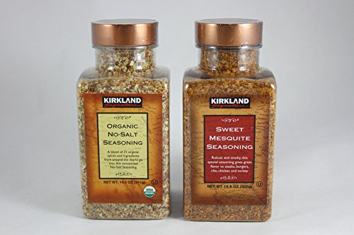 1 19.6 oz jar of Kirkland Signature Sweet Mesquite seasoning and 1 14.5 oz jar of Kirkland Signature Organic No-Salt Seasoning.