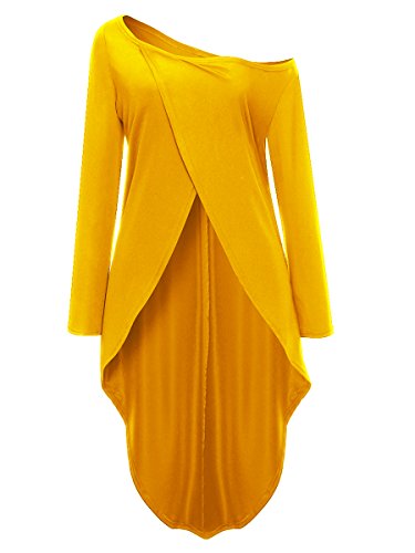 KISSMODA Women’s Sexy Off Shoulder High Low Tunic Dress Loose Long T Shirt Tops Yellow Small