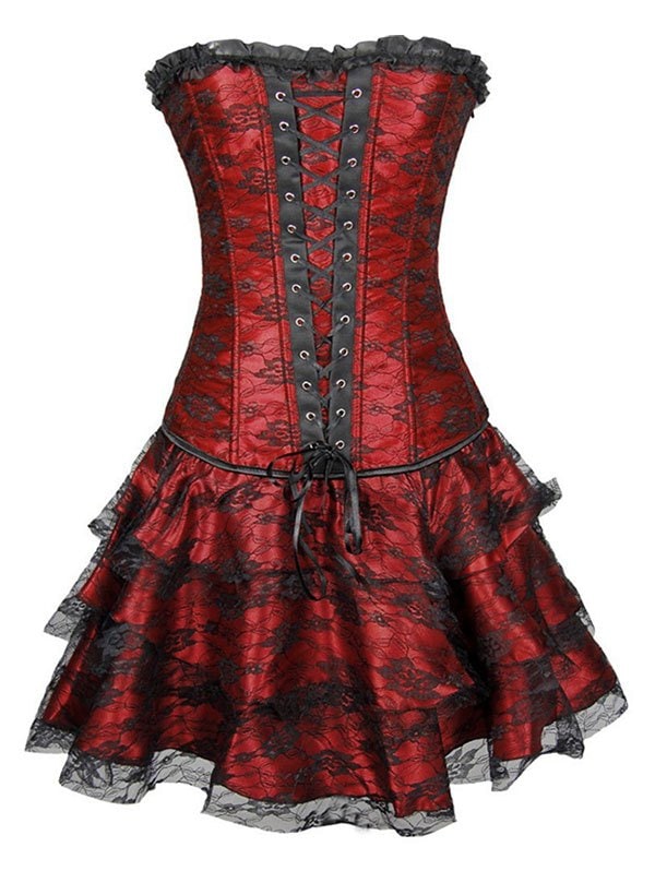 Lace Panel Lace-up Overbust Boned Corset Set with TuTu Petticoat