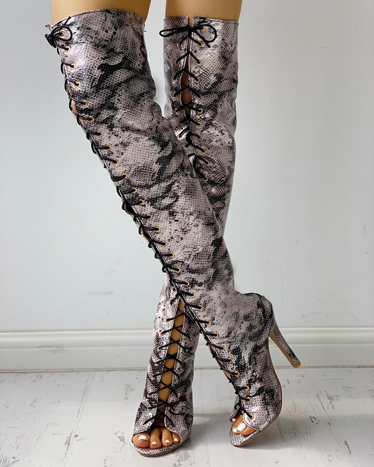 Lace-Up Bandage Eyelet Peep Toe Long Boots