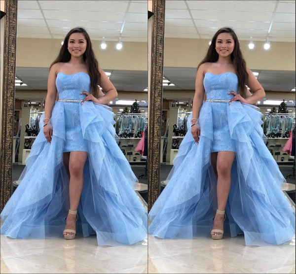 Light Sky Blue Lace Prom Dresses Ball Gown Detachable Train Ruffles Beaded Sashes Strapless Sweet 16 Dress Evening Gowns Party Formal Gowns
