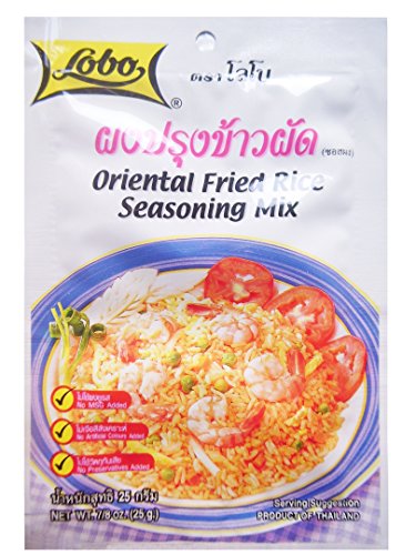 A typical Thai version of fried rice is easy to prepare with “Lobo” seasoning. This versatile dish is a complete meal in itself with the addition of more meat and vegetable on the side. No colouring, MSG or Preservatives Added. Allergen Information: Contains Soybeans.Lobo brand Oriental Fried Rice Seasoning mix makes a typical Thai version of fried rice that is easy to prepare.
