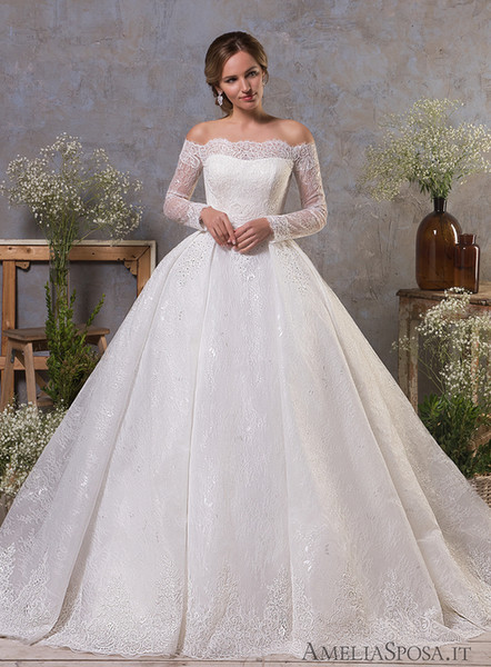 Long Sleeve Lace Wedding Dresses 2019 Princess Off the Shoulder Bridal Gowns Ball Gown Formal Dress for Bride Zipper Back with Button