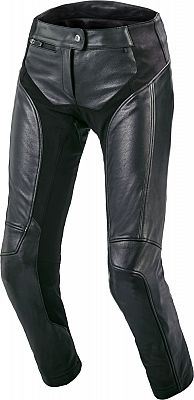 Motorcycle pants in leather and fabric, with an eye-catching look and designed to adapt to the female form, offering excellent comfort both on and off the bike. Features