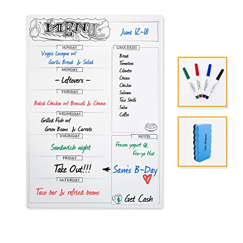 COMPLETE MENU PLANNER SET: Comes With 4, Non-Toxic, USA-Made & ASTM-4236 Compliant Erase Board Markers (Black, Blue, Green, Red) PLUS A Magnetic Eraser!
