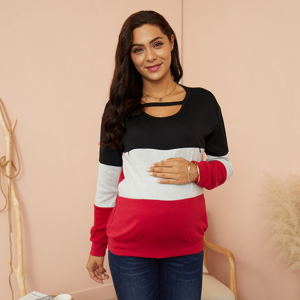 Maternity Round collar Color block Long-sleeve Nursing Tee