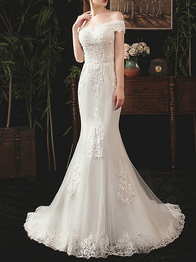 Boho Lace Wedding Dress With Sleeves | Long Sleeve Lace Trumpet Wedding Dress With Long Train | Vintage Lace Mermaid Wedding Dress With Train | Bohemian Vintage Wedding | Lace Bridal Dress | Bohemian Long Sleeve Lace Wedding Dress | Off Shoulder Lace Wedding Gown | Elegant Mermaid Wedding Dress