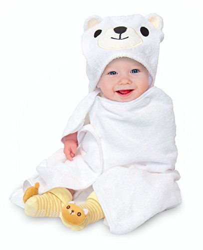 Wrap your infant or toddler in luxury with a large, white 100% cotton bath towel that has a polar bear design on its easy-to- use hood.