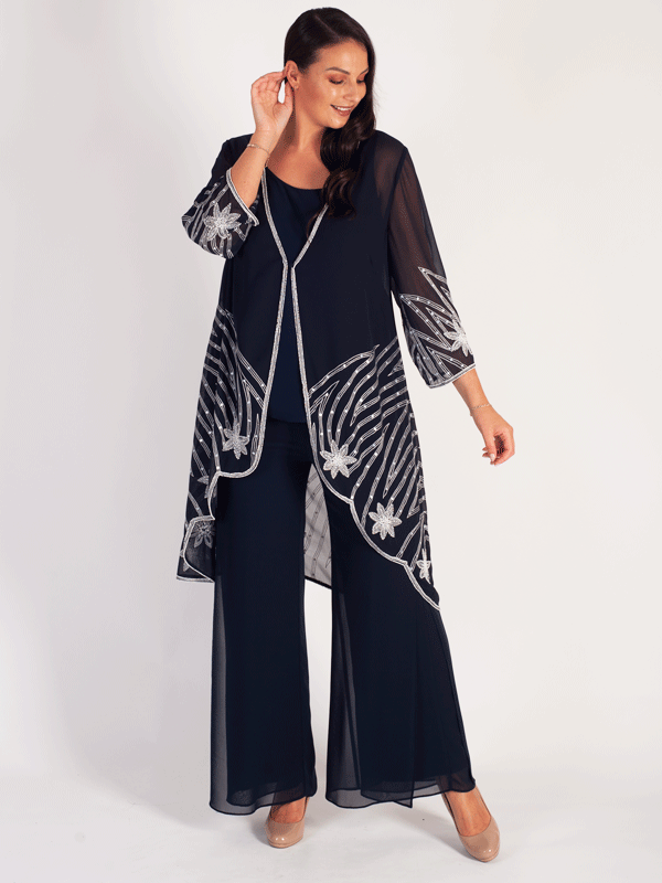 Navy Beaded Floral Motif & Embroidered Chiffon Coat with Scalloped Hem