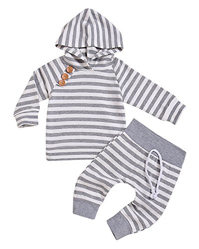 Newborn Baby Boys Girls Hooded Sweatshirt T-Shirt Tops+Striped Pants Kids Outfits Clothes Set (Grey, 6-12Months)