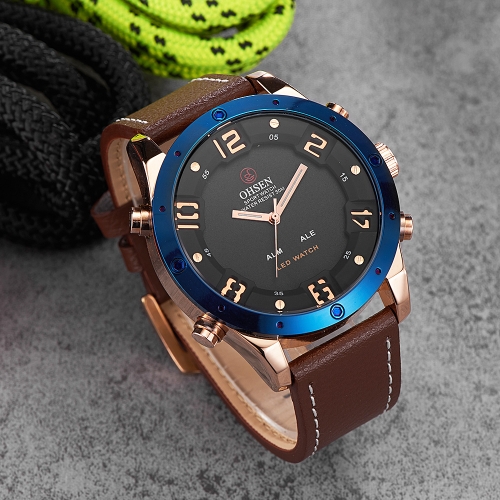 OHSEN Dual Display Digital Quartz Men Watch Water-Proof Casual Wristwatch Genuine Leather Cool Man Sports Watch Backlight/Alarm Masculino Relogio