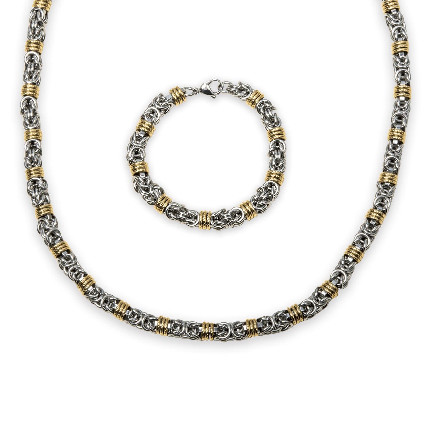 Our sensational men’s multi-link necklace and bracelet set is a popular choice of men’s jewelry to give to the man in your life. The two toned look of our premium stainless steel chain, with added 18k gold features, brings added interest to the set. You can pair either piece with other stainless steel jewelry you may already own, or wear the items alone for a chic look. Perfect as a gift or treat for yourself.
