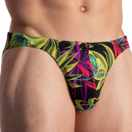 Low-rise swim brief made from lightweight, comfortable and fast-drying microfiber. Original colorful tropical print. Sexy and fitted cut. Lined front pouch. Olaf Benz silicone logo on the thin elastic waistband.