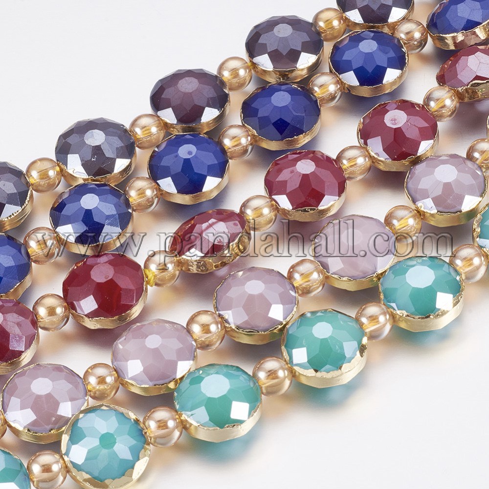 Opaque Glass Beads Strands, with Brass Findings, Pearl Luster Plated, Faceted, Flat Round, Golden, Mixed ColorSize: about 14mm in diameter, 9mm thick, hole: 1mm; round: 6mm in diameter; about 10pcs/strand, 7.4″ (19cm).