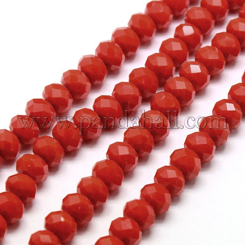 Opaque Solid Color Crystal Glass Rondelle Beads Strands, Faceted, RedSize: about 8mm in diameter, 6mm thick, hole: 1mm, about 67pcs/strand, 16.5″.These glass beads may give you a feeling of elegant and exquisite. They can be used many ways – such as jewelry, strung in your window, and also are ideal for necklaces, bracelets and so on.