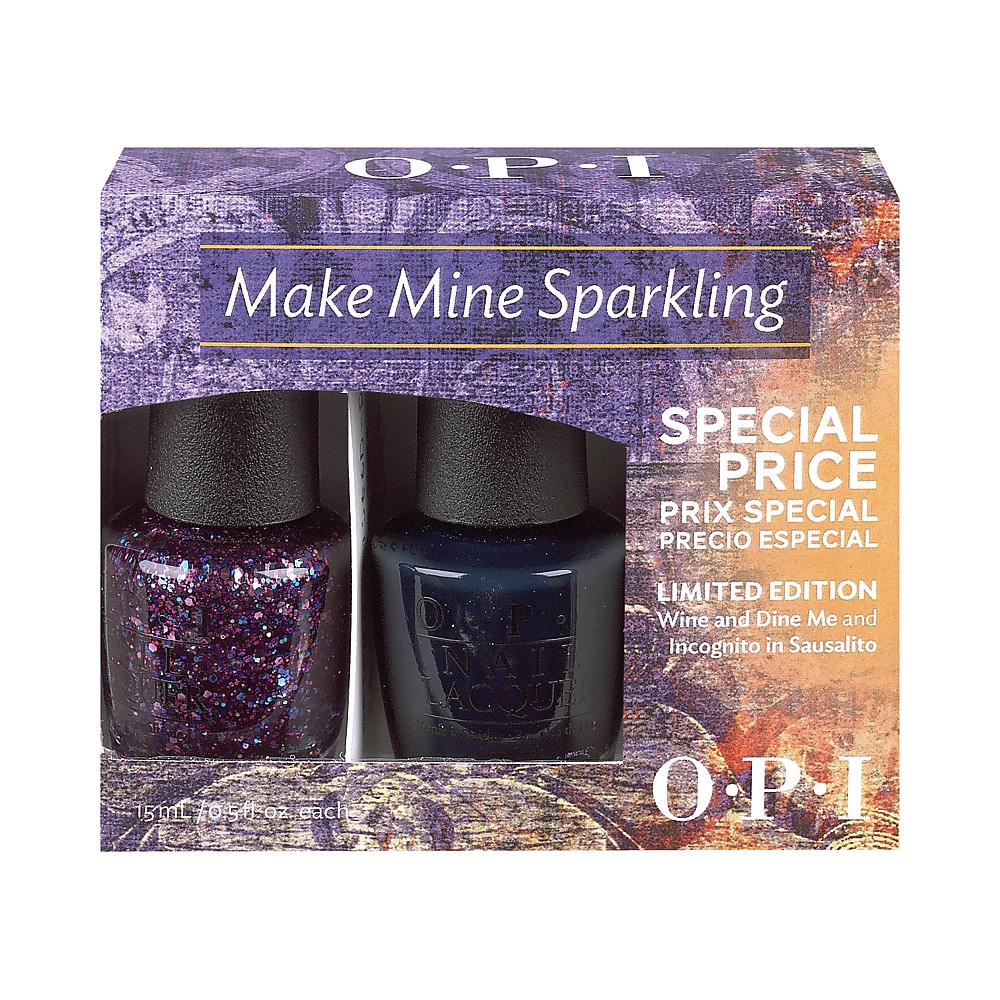 Make Mine Sparkling is a duo of limited edition Nail Lacquers from OPI that will definitely make nails dazzle. Contains two striking colours, one infused with glitter for a memorable evening look.With OPI s high-quality formula and Pro-Wide Brush for easy application, each lacquer is supplied in OPI’s patented, signature glass bottle, a symbol for richness of colour, long-lasting wear and high-gloss shine.Contents: Wine and Dine Me 15ml; Incognito in Sausalito 15ml.