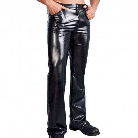 Pants made from sleek, stretch and shiny leatherette. Straight cut. 5 pockets. Fly with protected zipper and 1 button. Belt loops.
