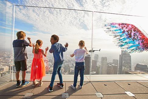 OUE Skyspace LA boasts a thrill experience unlike any other: Skyslide, an outdoor glass slide, positioned nearly 1,000 feet above downtown Los Angeles. The Skyslide is forty-five feet long, approximately 4 feet wide and made entirely with 1-1/4 inches thick glass. Visitors will experience Skyslide’s unparalleled views in a whole new way as they glide from the 70th to the 69th floor of the U.S. Bank Tower. *Additional Charge applies.