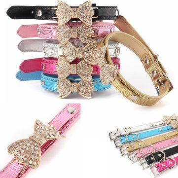 Personalised Rhinestone Diamante Crystal Bow Bling Pet Cat Dog Collar PU Leather