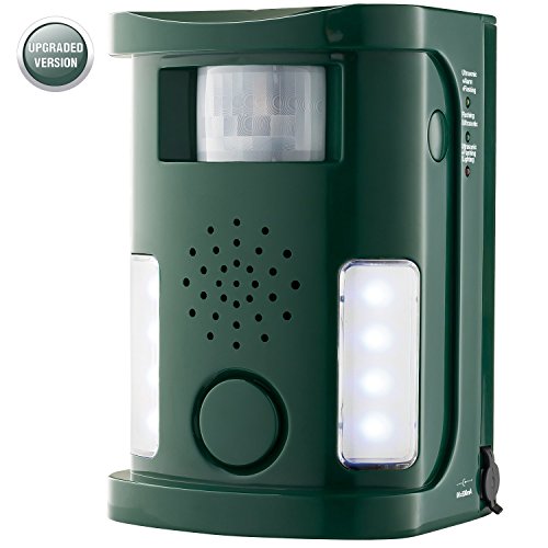 Eliminate pest problems effectively and permanently with this aggressive ultrasonic/sonic flashing light animal repeller. Select your mode of ultrasonic, sonic and strobe flashing. Get rid of Cats, Dogs, Squirrels, Deer, Bears, Birds (Pigeons, Woodpeckers, Seagulls, etc.), Skunks, Bats, Rats, Foxes, Raccoons, Mice and much more.