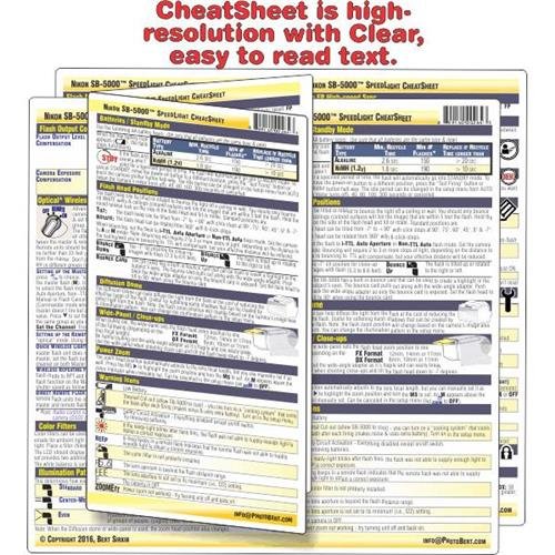 PhotoBert CheatSheet for the Nikon SB-5000 SpeedLight This is a one-of-a-kind CheatSheet for the Nikon SB-5000 SpeedLight – Professionally designed by a photographer – for photographers. Nobody can remember all of the features, modes and the “how to” instructions so here’s an “easy to take with you” quick reference that is invaluable in the field. This CheatSheet is full of useful information on how to use the various features of this flash. Covered topics include: Battery Information Menu reference Standby Mode Setup Menu reference Flash Head positions Key lock Diffusion Dome use Guide Numbers Wide Panel use Flash output compensation Power zoom Optical wireless flash (Advanced wireless lighting) Warning icons reference Color filters Flash Modes Illunmination Patterns Repeating flash Auto FP High-speed sync Info menu AF-Assist Restore to default settings Test Firing Unified Flash control Modeling IlluminationLaminated for durability