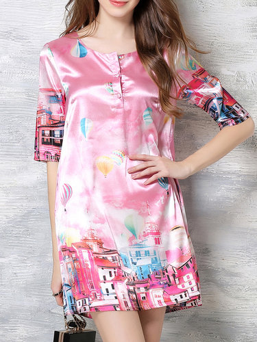 Pink H-line Printed Crew Neck Half Sleeve Mini Dress