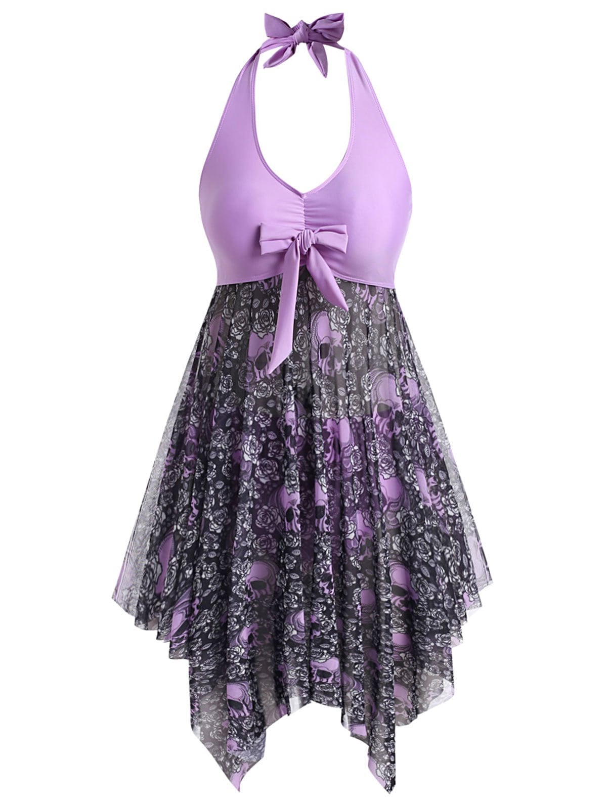 Plus Size Floral Skull Mesh Halloween Tankini Swimwear