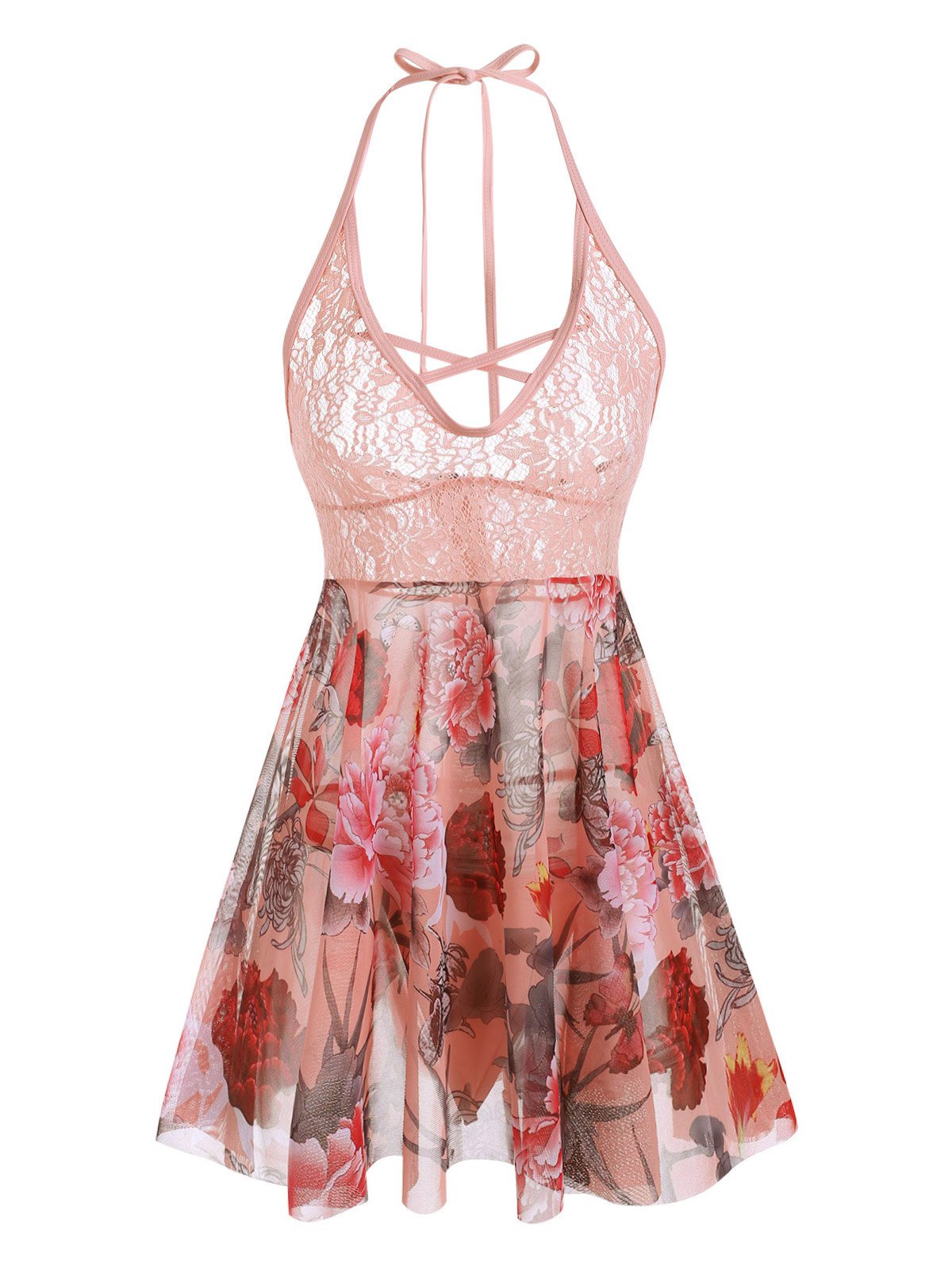 Plus Size Halter Lace Insert Backless Floral Babydoll Set