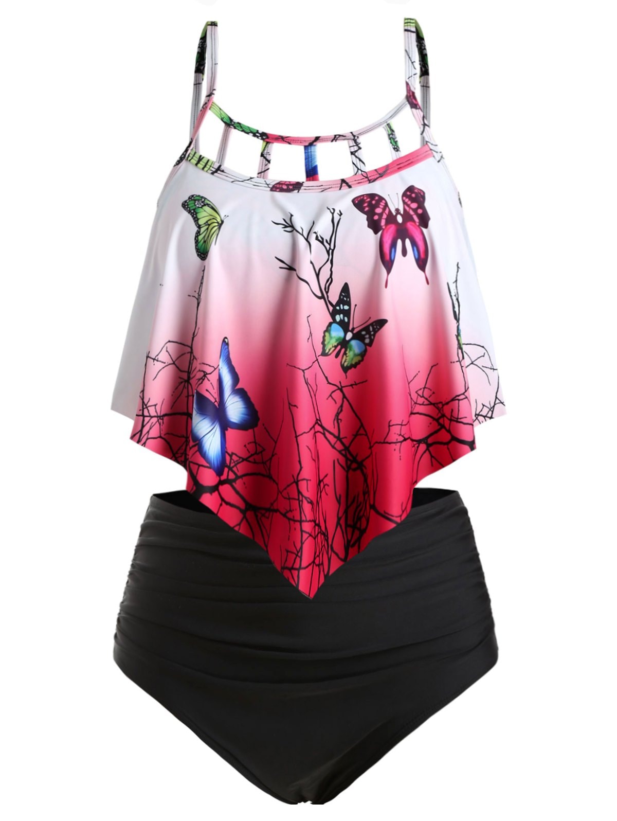 Plus Size Overlay Ombre Butterfly Print Tankini Swimwear